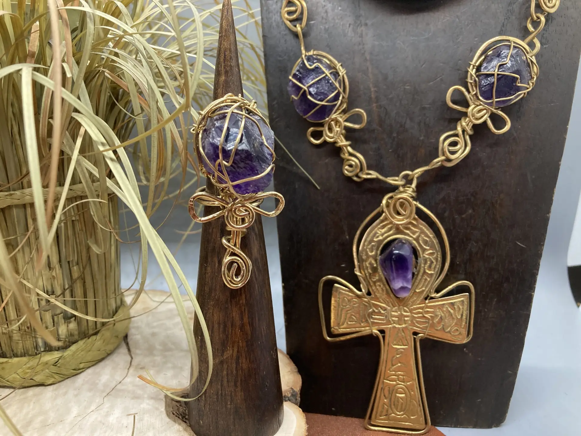 Good vibes, peace of mind, clarity and more are found with amethyst. The Ankh pendant is from Ethiopia, the raw deep amethyst comes from Zambia. This set exemplies Aboriginal Bling Blam regality to the highest order. Set is sized to fit.