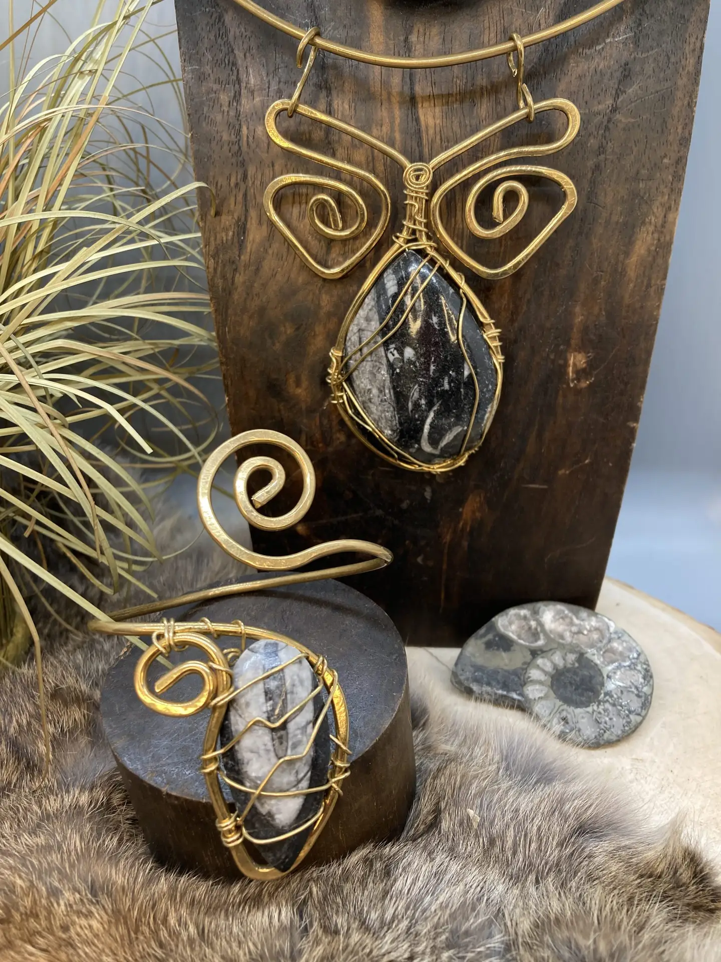 Talk about an oldie but goodie, these 50 million year orthacera fossils still light up the room. Orthacera is a great stone for depression. Being a very grounding stone, it assists in balancing emotions and increasing confidence. Set to brass this set is sized to fit.