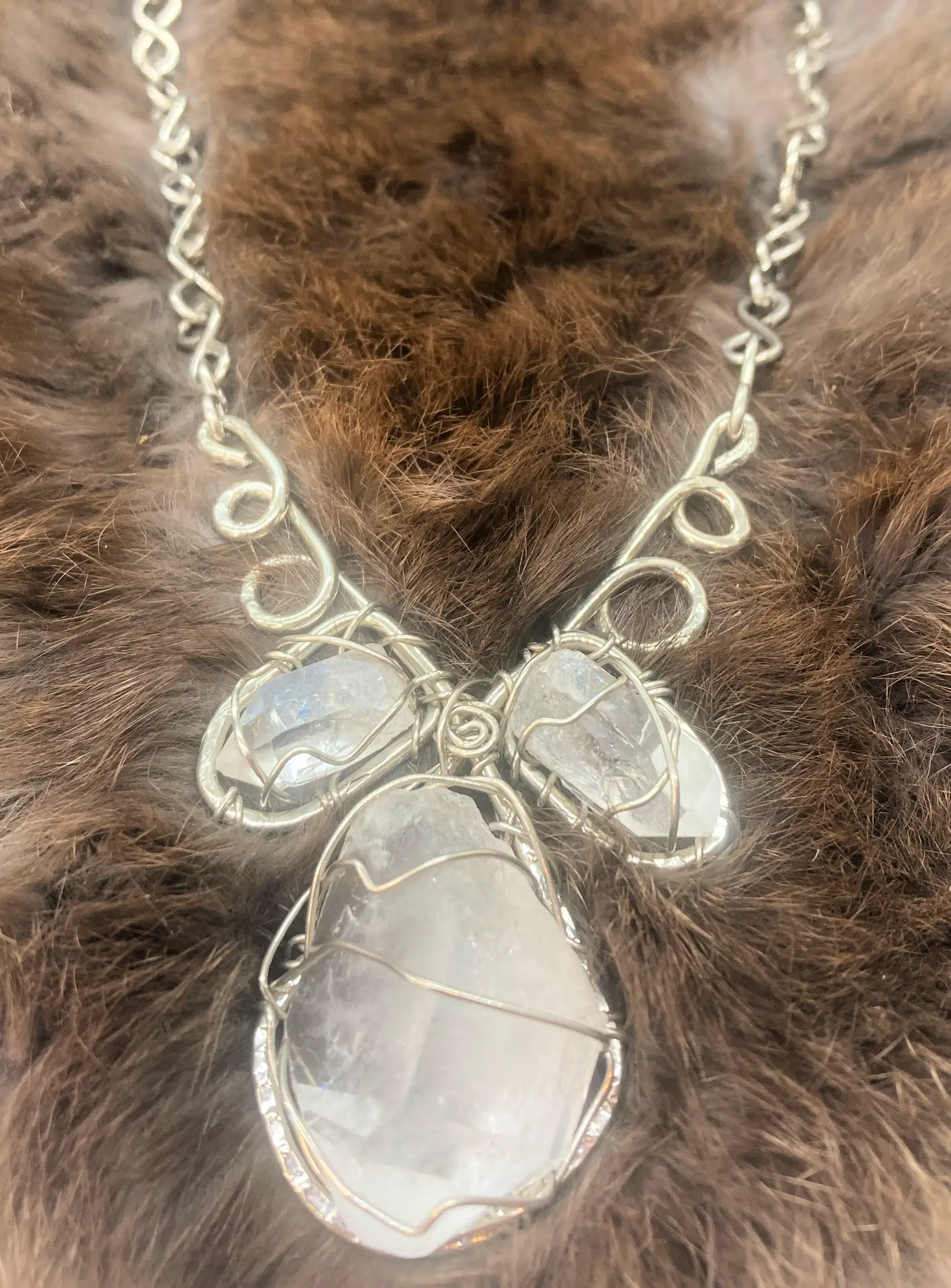 Clear quartz is the mother to all crystals. Amplify and attunement are some of the great aspects of this crystal and more! This unit multi-stone design features three outstanding brazilian quartz in the pendant.