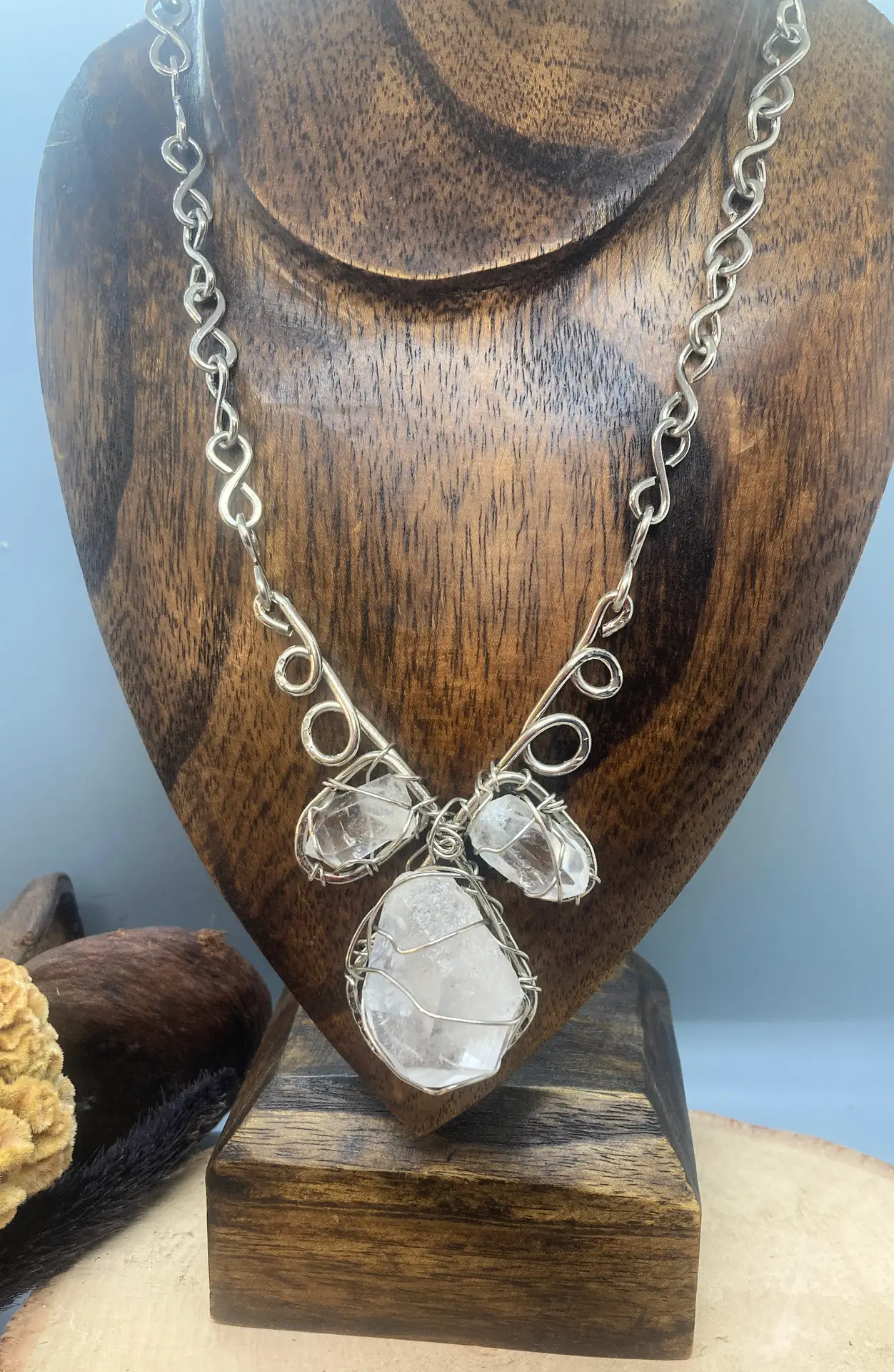 Clear quartz is the mother to all crystals. Amplify and attunement are some of the great aspects of this crystal and more! This unit multi-stone design features three outstanding brazilian quartz in the pendant. Chain measures about 18 inches.