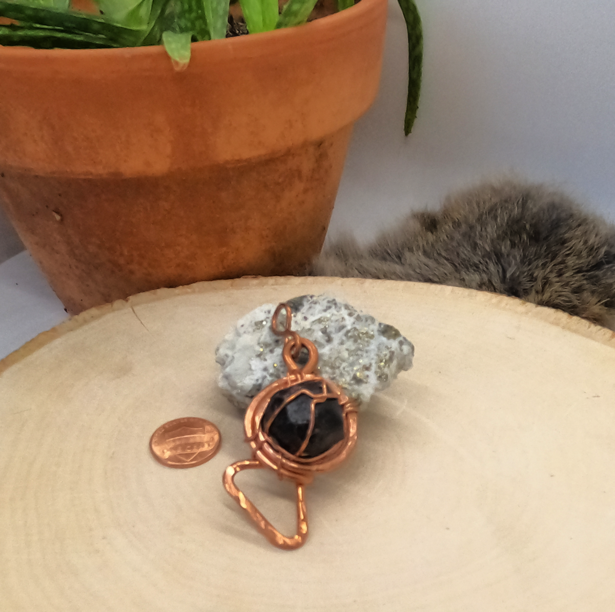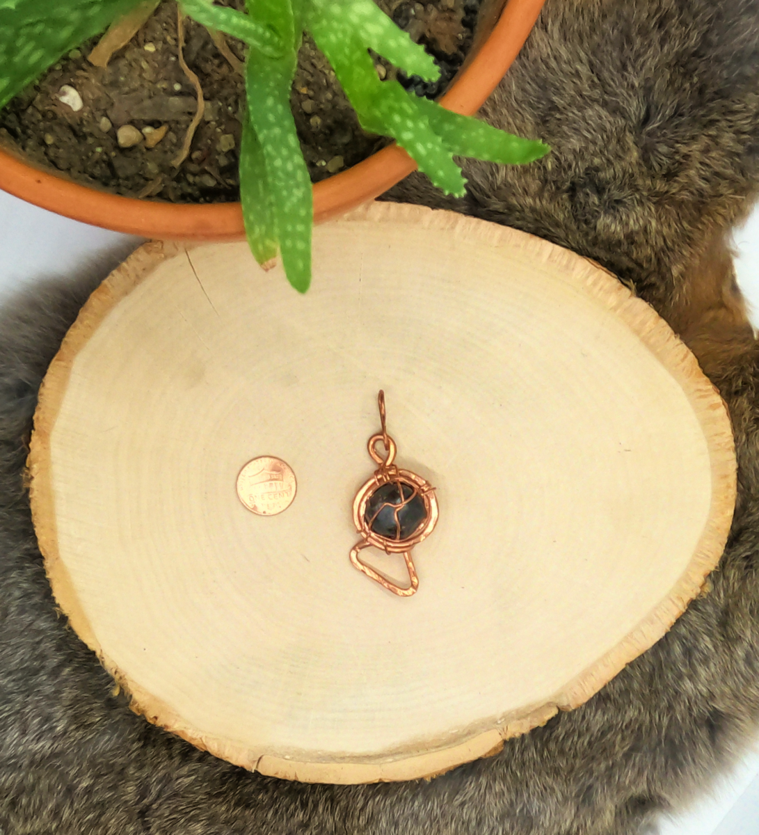 This unique copper garnet stone pendant is good for strength and security. It boasts a centered setting, but with an asymmetrical design. While looking dark brown or black, it is actually a deep pomegranate red when shown in sunlight.