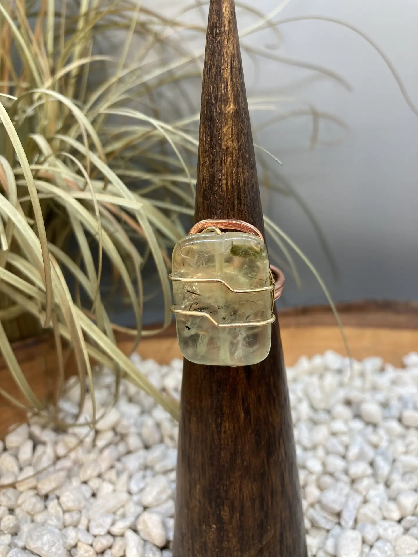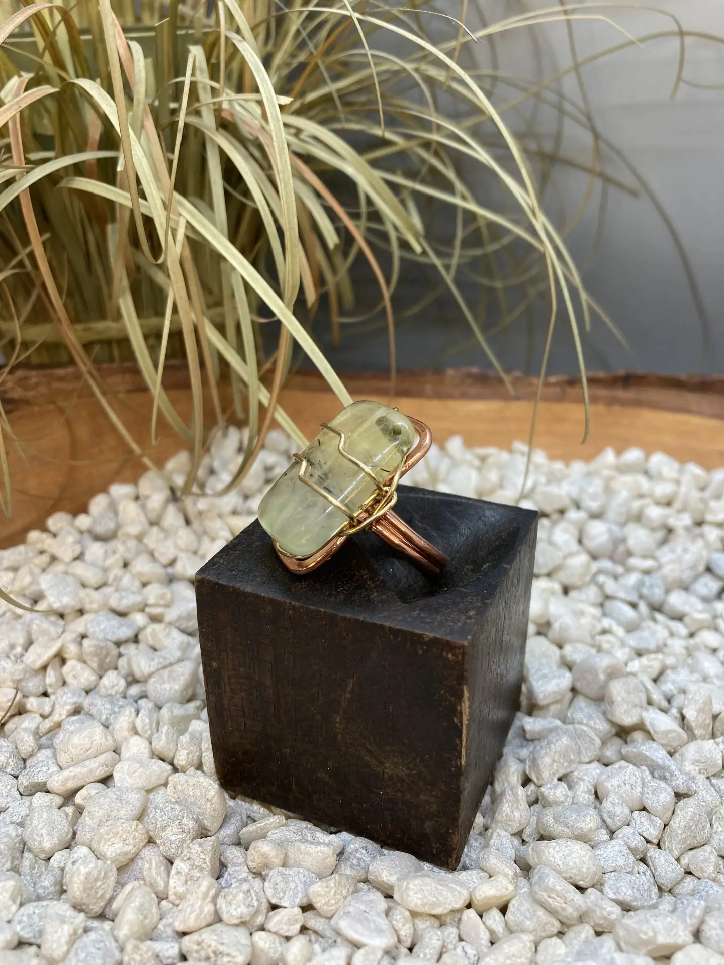 Prehnite is heals the healer, Prehnite is a supreme love crystal for the heart chakra. This ring is set to copper with hints of brass top wrap wire.
