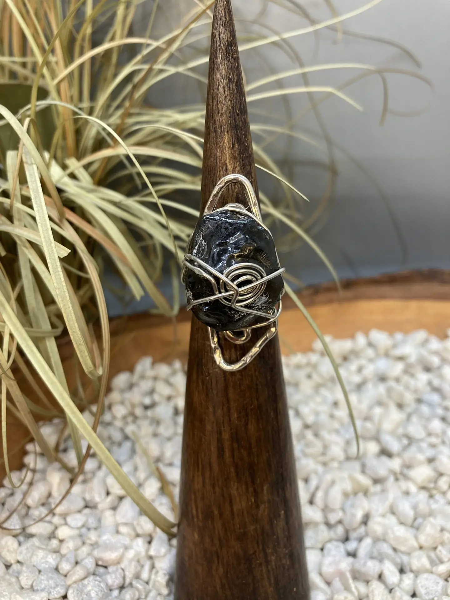 Apache Tear is a more gentle form of obsidian. It also aids in pyschic protection. Add to your mysticism with this raw apache tear ring.