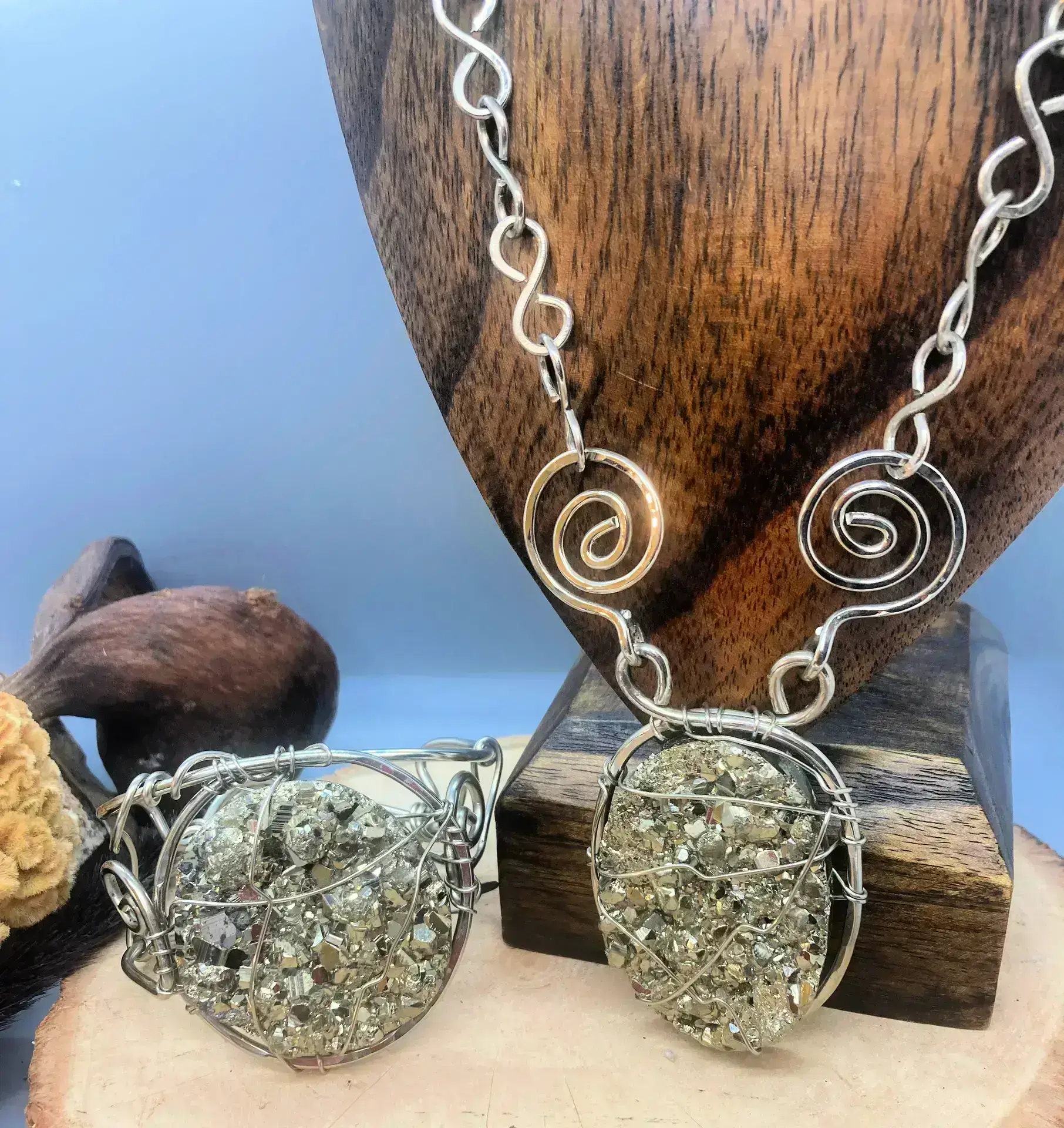 Lift up yourself with this pyrite jewelry set. Pyrite is about that action as it is a fire stone. Manifest and plow through your ambitious pursuits with iron pyrite. This 2Pc set boasts a 24 in chain necklace and spectacular robust bracelet.