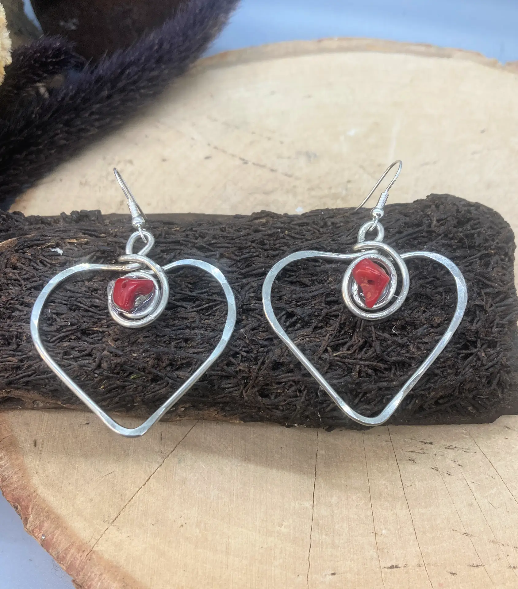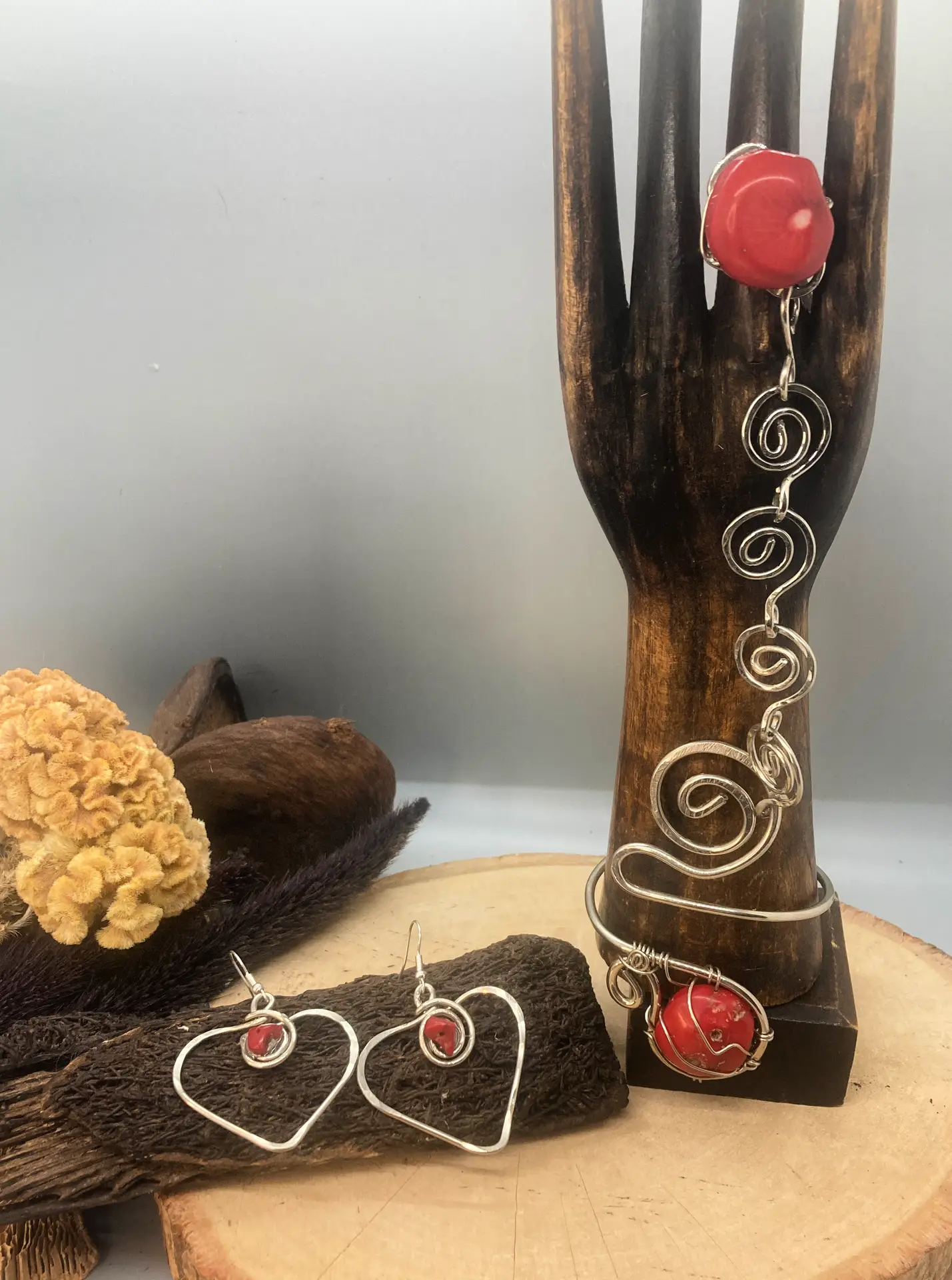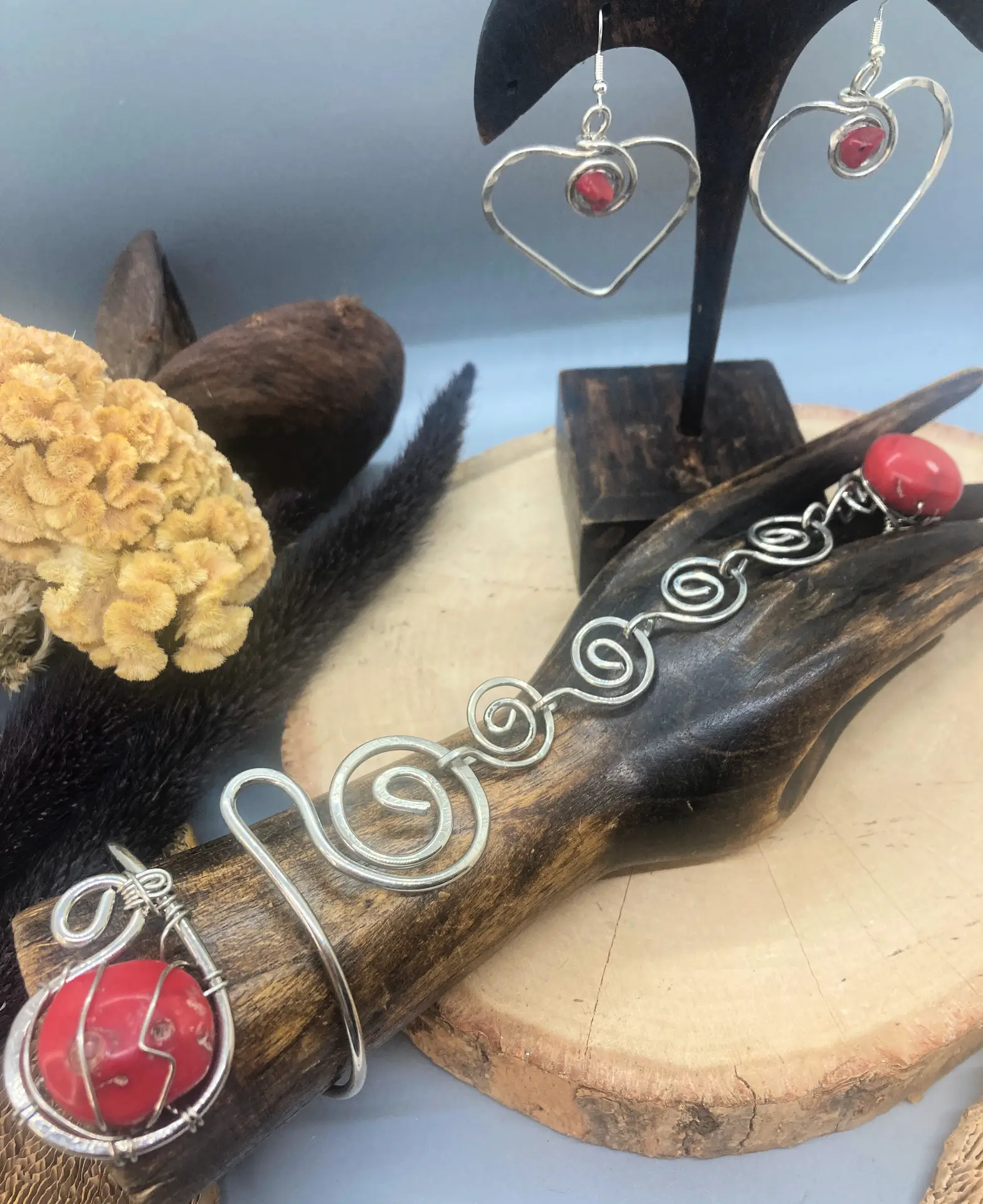 This red coral jewelry set is made to evoke passion and awaken the inner goddess. While not a stone, red coral is known for healing, protection and wisdom. Enjoy this 2 pc set with heart shaped earrings and this goddess chain. Set is made with Nickel Silver. Earring hooks are Nickel Free and hypoallergenic.
