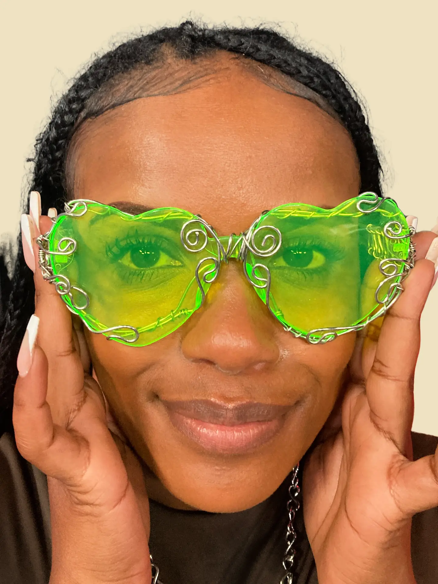Wear these neon green heart shaped Solar Spex to work or play. These feature our unique wire design and craftsmanship. Made of Nickel Silver.