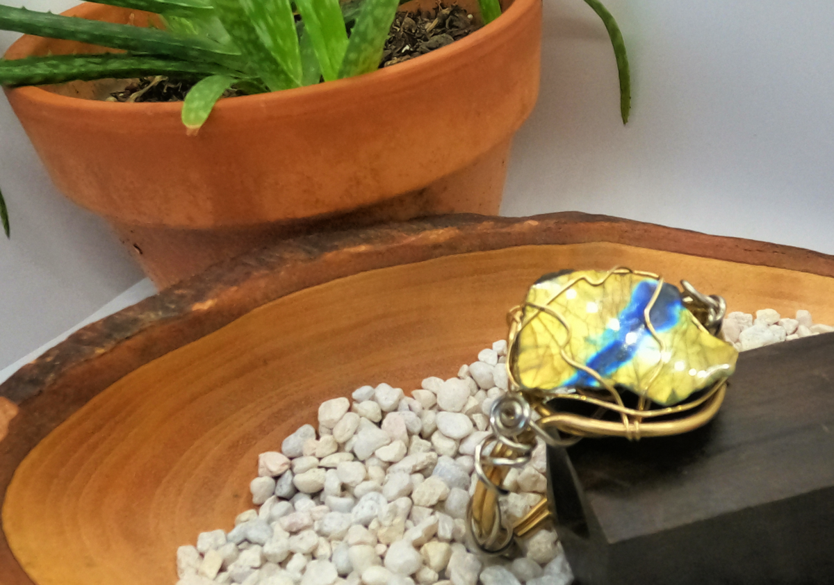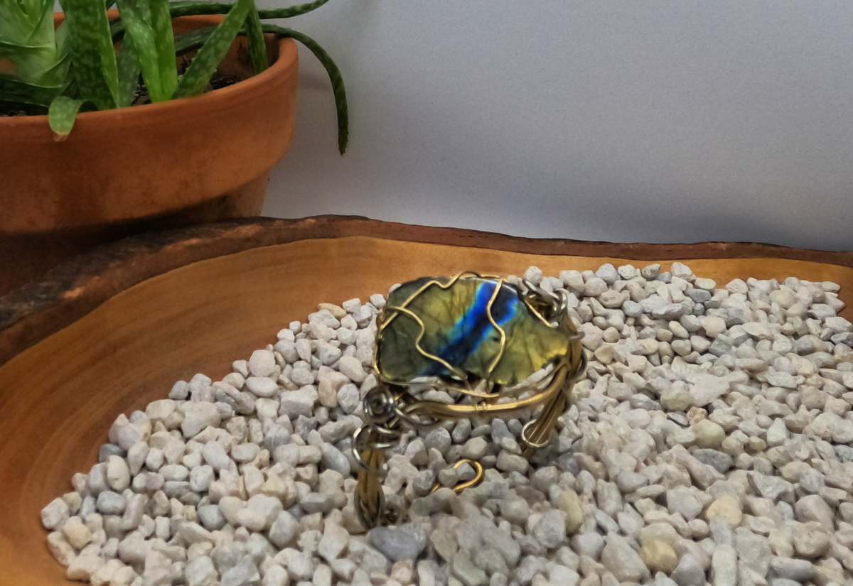 Two tone labradorite bracelet is styled with both brass and nickel metals. This combination helps to further illuminate the glow of this magical stone. Known as an ‘aura sealer and protector”, this stone never fails in it’s hidden appeal. This stone reminds you to “never judge a book by it’s cover”, as this grayish/greenish stone comes alive as soon as light hits it. Find the right angle and enjoy the light show. This Unisex bracelet is sized to fit.