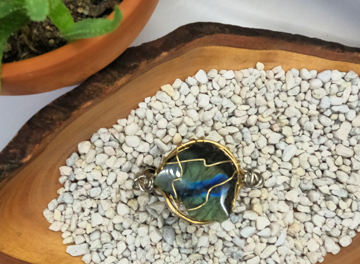 Two tone labradorite bracelet is styled with both brass and nickel metals. This combination helps to further illuminate the glow of this magical stone. Known as an ‘aura sealer and protector”, this stone never fails in it’s hidden appeal. This Unisex bracelet is sized to fit.