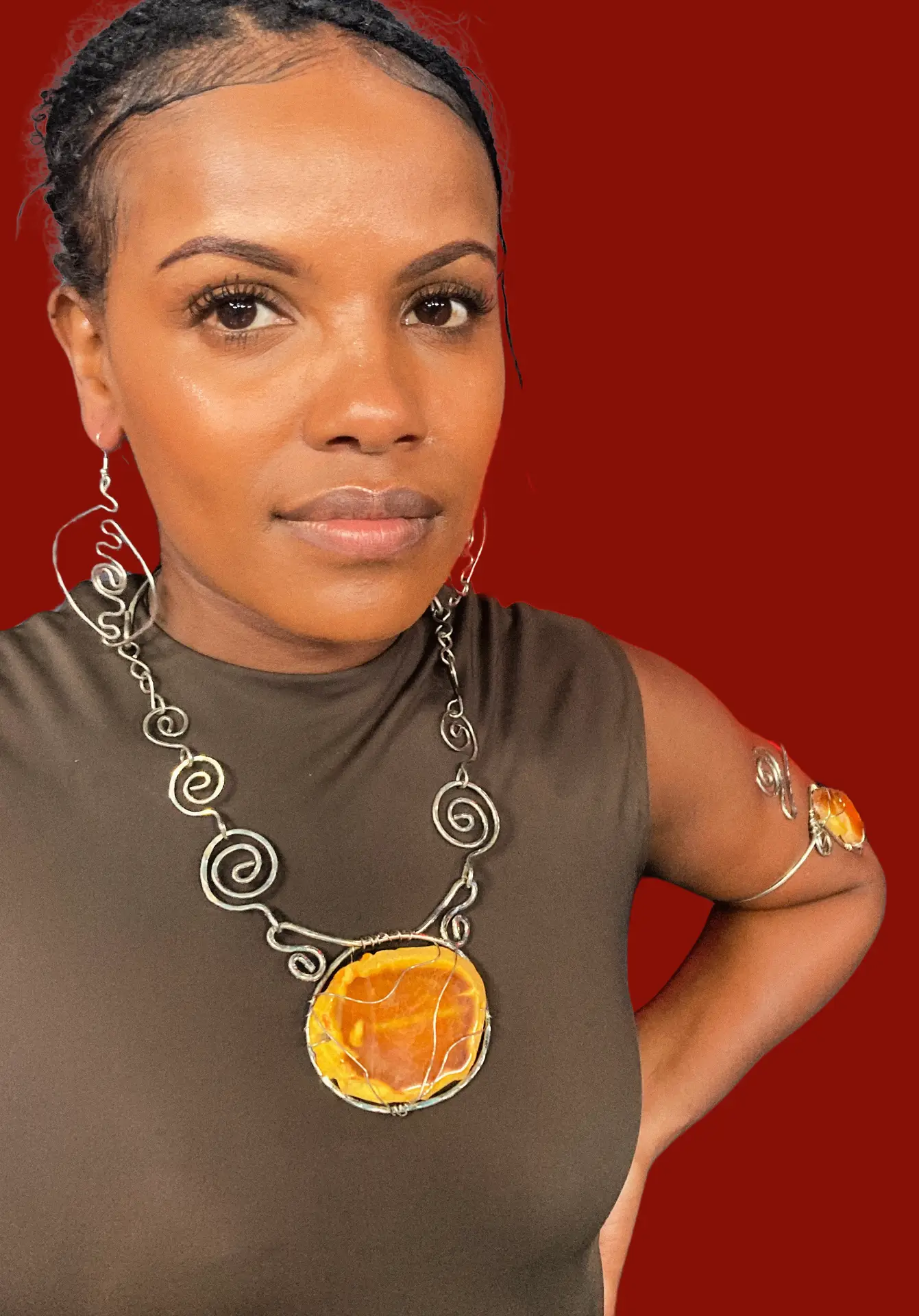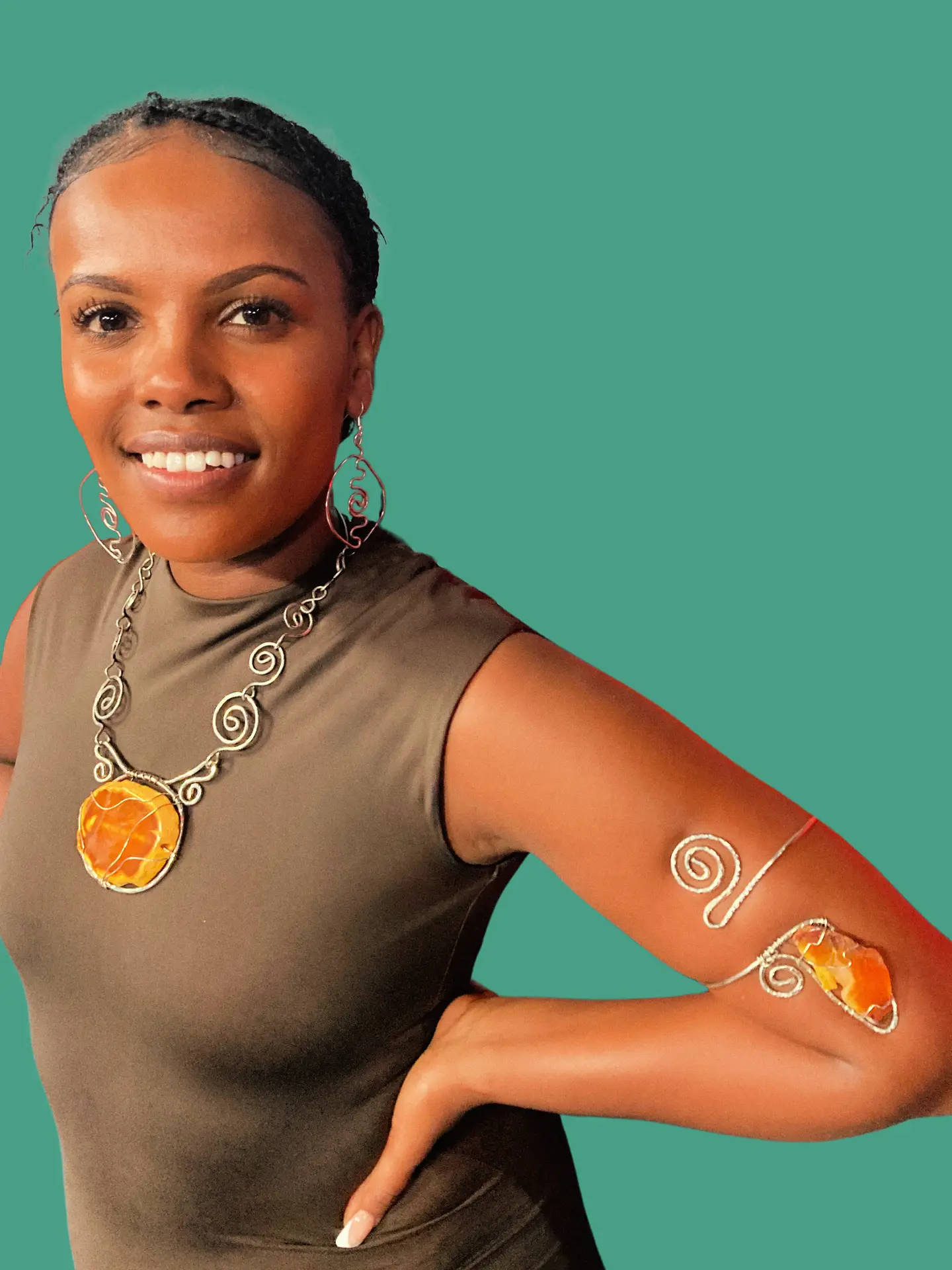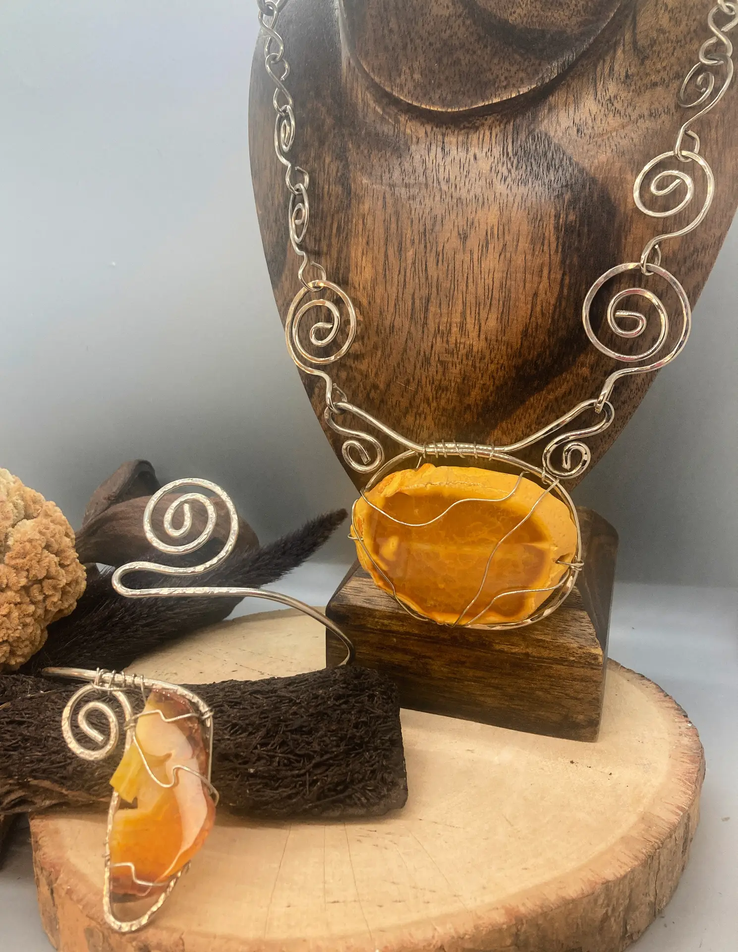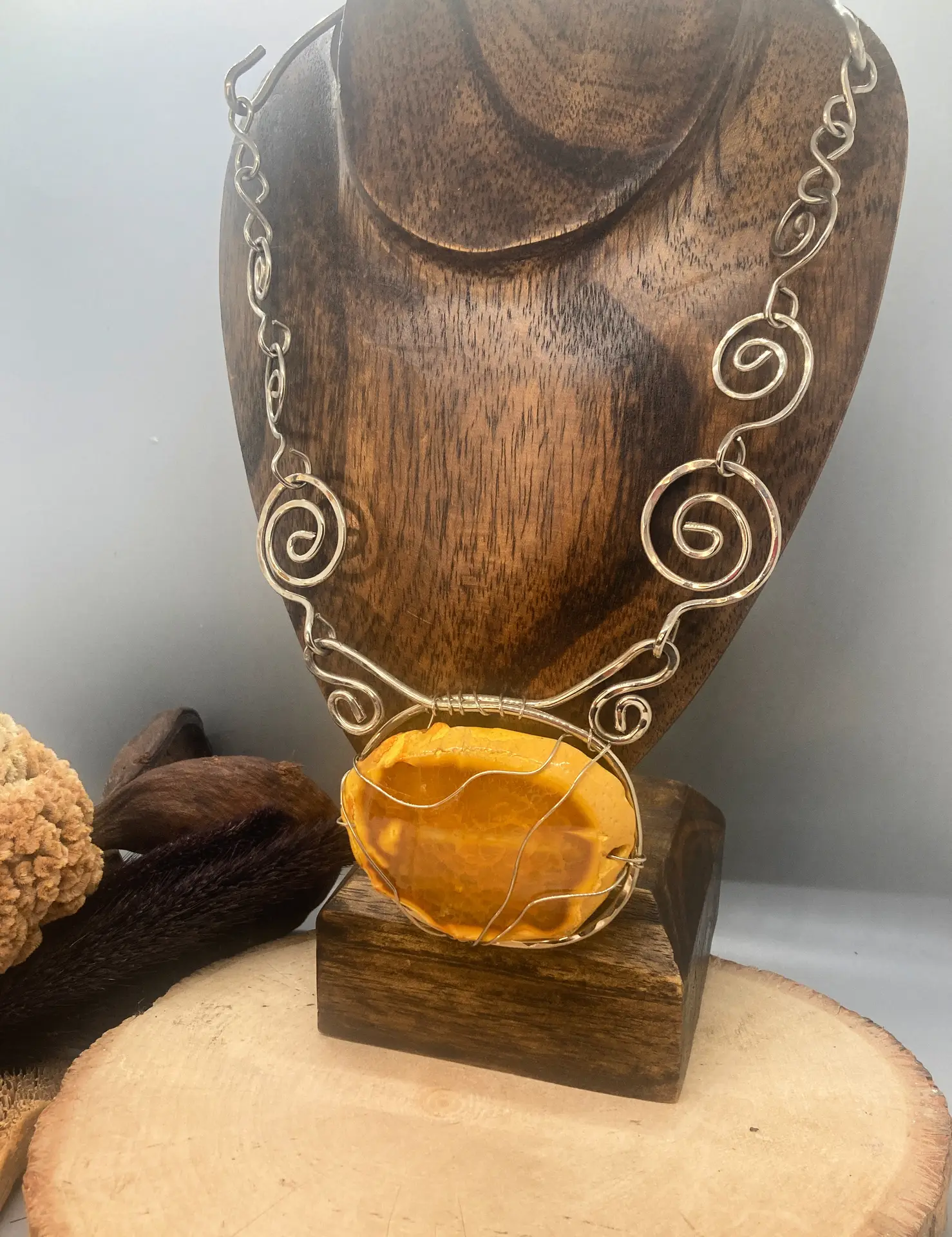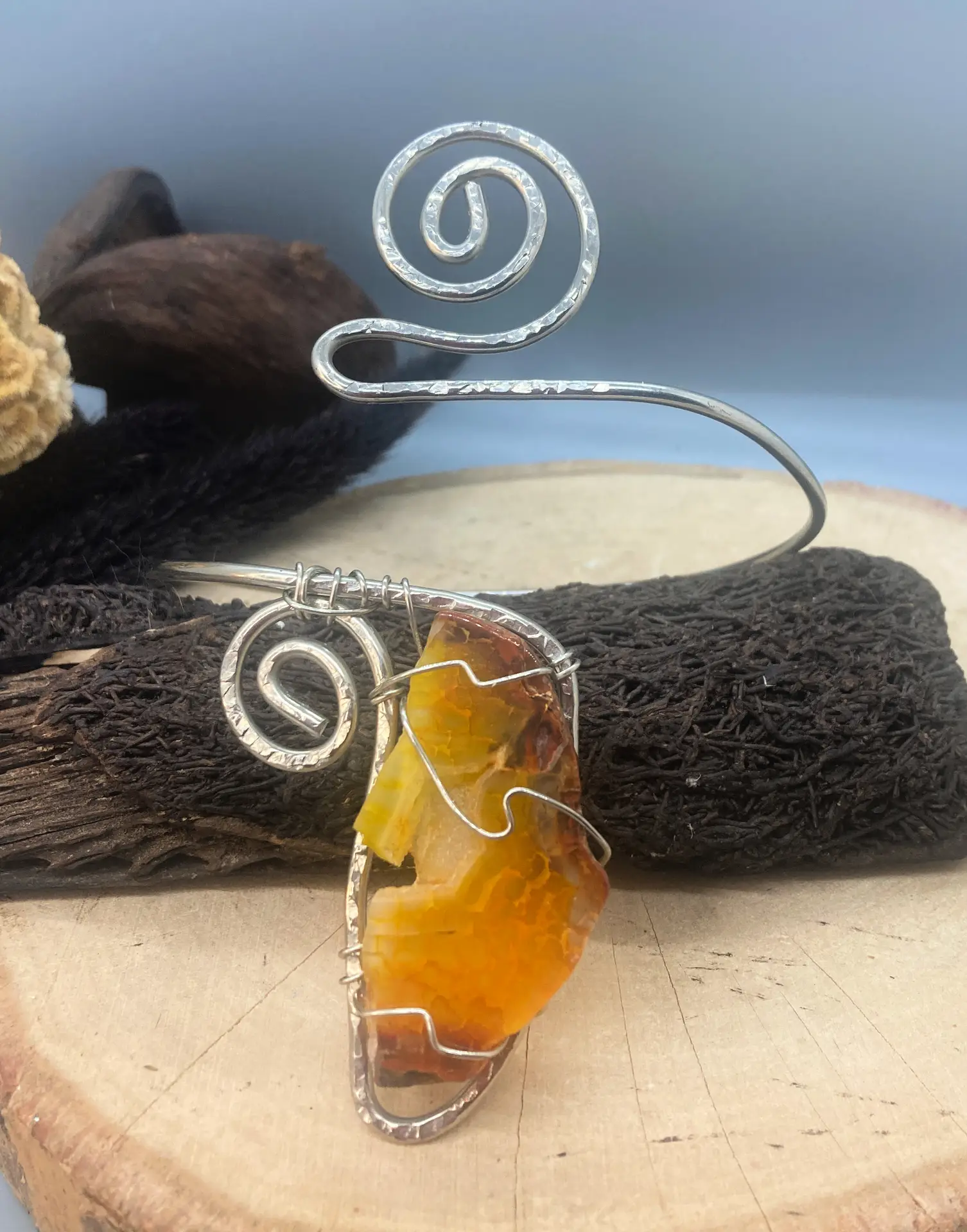 This yellow agate will brighten you up and your outfit! Known to bring harmony and stability this agate makes a wonderful spiritual assistant. Breathe life into your world with this outstanding arm bangle as well. Necklace is made of nickel silver , chain measures approximately 18 inches.